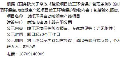 根據(jù)《國務(wù)院關(guān)于修改《建設(shè)項目竣工環(huán)境保護(hù)管理條例》的決定》(國務(wù)院令第682號),以及 環(huán)保部《關(guān)于發(fā)布<建設(shè)項目竣工環(huán)境保護(hù)驗收暫行辦法>的公告》(國環(huán)規(guī)環(huán)評[2017]4號),現(xiàn)將商洛市銘瑞電器有限公司封閉環(huán)保自動噴塑生產(chǎn)線項目竣工環(huán)境保護(hù)驗收內(nèi)容(包括驗收報告、驗收意見)公示如下: 項目名稱:封閉環(huán)保自動噴塑生產(chǎn)線項目 建設(shè)單位:商洛市銘瑞電器有限公司 公示內(nèi)容:竣工環(huán)境保護(hù)驗收報告、專家意見等(詳見附件) 公示時間:即日起20個工作日 ...
